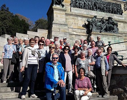 Am nächsten Morgen fuhren wir nach Rüdesheim. Dort wurden wir schon von unseren 2 Stadtführerinnen erwartet. Bei herrlichem Wetter war unser 1. Ziel das Niederwalddenkmal (siehe Gruppenbild), mit seiner 10,5m hohen Statue der Germania, die zum Gedenken an die Gründung des Deutschen Reiches 1871 aufgestellt wurde. Von hier oben bot sich uns eine super Aussicht auf Rüdesheim, auf Bingen und auf die Nahemündung. Dann fuhren wir zurück und begannen mit der Erkundung der Stadt. Rüdesheim ist eine kleine Weinstadt , die vor allem für Riesling bekannt ist. Im Zentrum der Stadt ist die berühmte Drosselgasse mit Geschäften, Kneipen und Restaurants, sie ist 144 m lang und 2 m breit. Im Brömserhof befindet sich Siegfried`s mechanisches Musikkabinett. Der Adlerturm gehört zur ehemaligen Stadtbefestigung und wurde im 15. Jahrhundert an der Südostecke der Altstadt erbaut. Nach der Stadtführung war Freizeit angesagt. Um 13.00 Uhr wurden wir im Weingut Prasser zur Weinprobe eingeladen und wir durften 4 Weinsorten verkosten. Die Zeit verging wie im Fluge und wir machten uns auf den Weg zu unserer Schiffsanlegestelle die Nr. 17 direkt am Bahnhof. Hier befindet sich seit 125 Jahren die Werksanlage der Firma Asbach Uralt, heute nur noch Besucher Center, da das Werk ausgelagert wurde